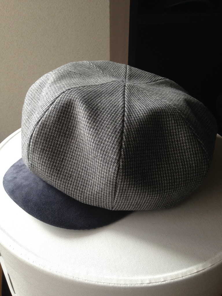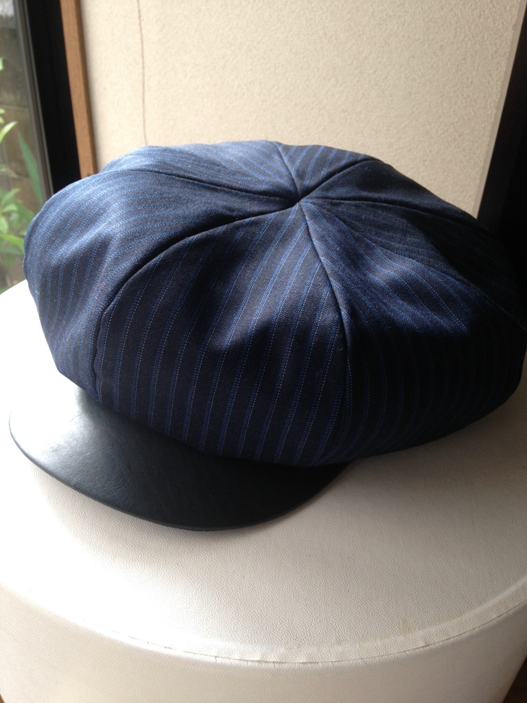 西堀様の頭の形に合わせた型で、8枚の縫い目には青系にあうエンジ色のパイピングを施し、傘の骨に見立てました。